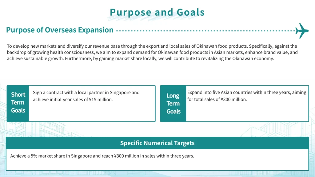 Outline objectives such as increasing the overseas sales ratio, establishing a stable revenue structure, and expanding brand recognition within a period of five years or longer.