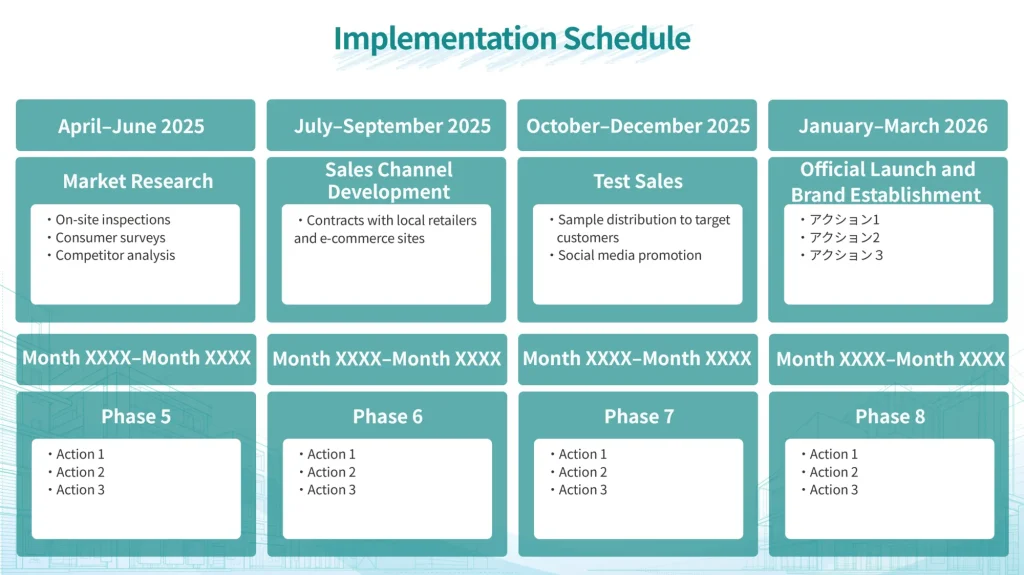The execution schedule outlines the project’s key phases and their progress. Set the duration for each phase.